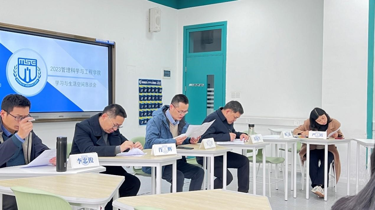 于11月21日在经世楼B205召开了2023下半年院级学习与生活空间恳谈会。学院分管教学副院长王宇、分管科研副院长肖辉、管理科学系系主任苏应生、电子商务系系主任李忠俊、辅导员严霞、本科教秘赖超参加会议。