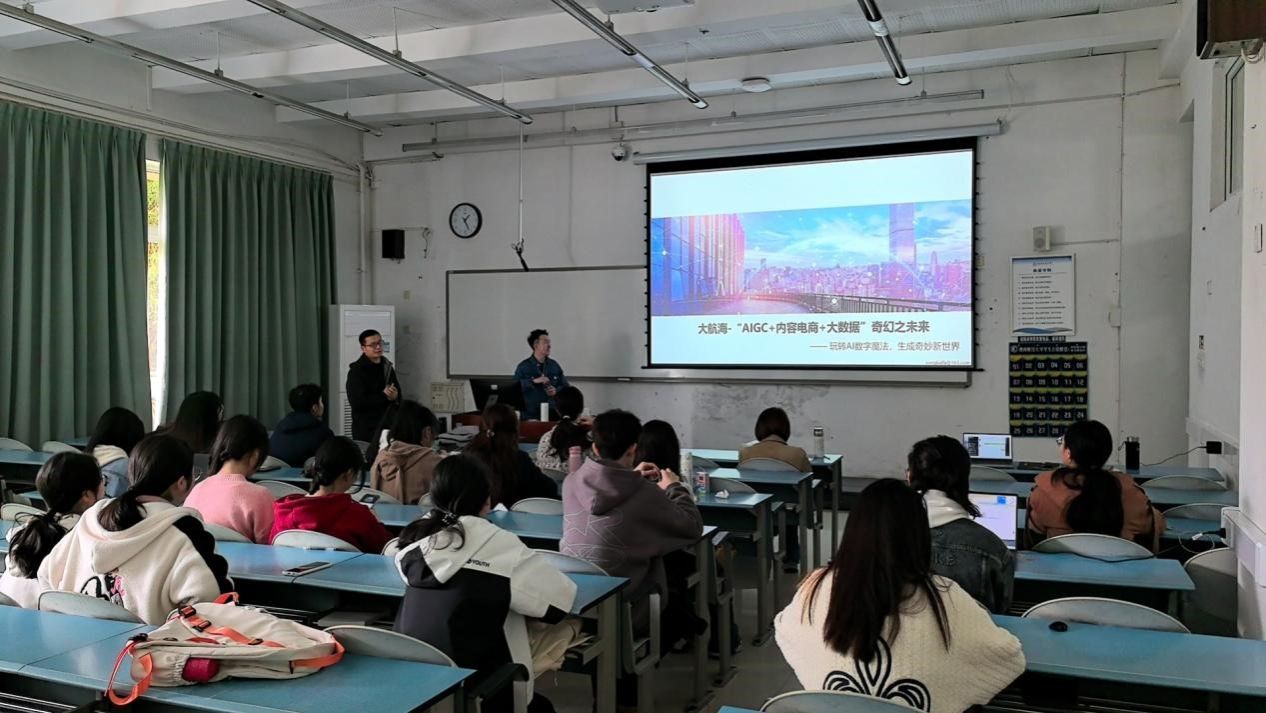 在颐德楼H104教室成功举办了一场别开生面的讲座,题为“玩转AI数字魔法,生成奇妙新世界”。本次讲座由电子商务系主任李忠俊和副主任张赟两位老师共同主持,学院教师代表及来自学校多个专业的几十名本科同学共同参加了此次讲座学习。