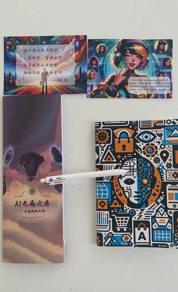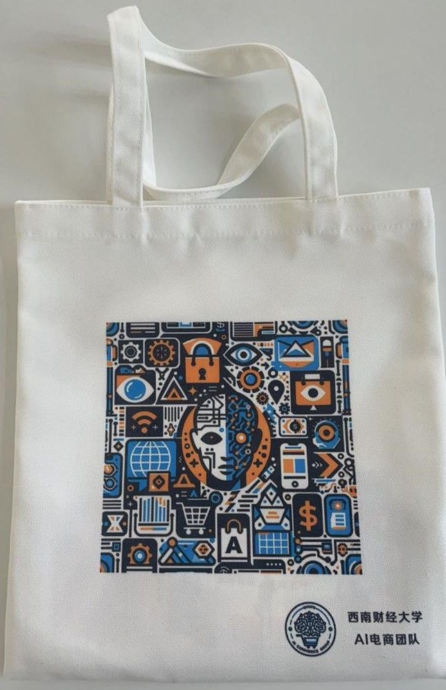 副主任张赟副教授向在座的老师同学们宣布,电子商务系正式成立AI电商团队,并全部通过AI技术制作了系列AI学习辅助作品:布袋、LOGO、笔记本、签字笔、卡片、宣传册等。讲座结束后,张赟副主任向到场听取讲座的同学分发了AI学习作品,也欢迎感兴趣的同学加入AI电商团队。