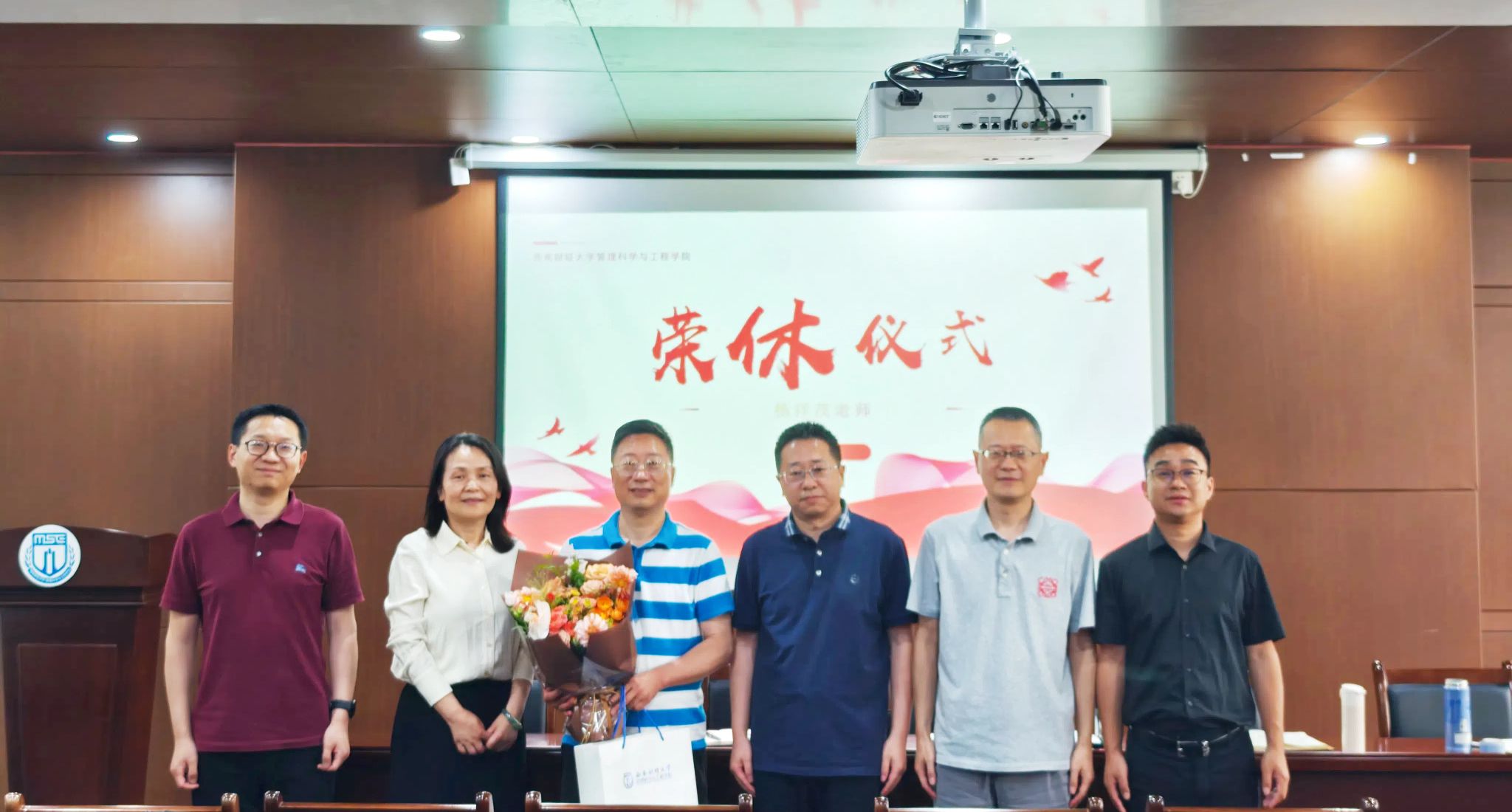 仪式最后,周敏和鲁万波代表学院为杨祥茂老师送上纪念品,学院领导班子全体合影留念。