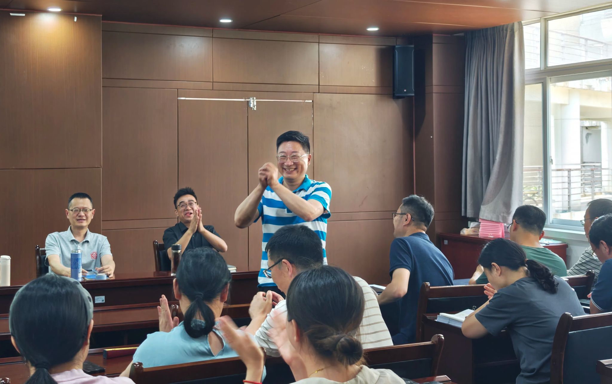 教师代表王宇、古永红、王俊分享了与杨祥茂老师共事的点滴,王宇用“专业”“敬业”两个词赞扬杨祥茂老师数十载如一日的教育生涯。王俊对杨祥茂老师深耕教学、重视课堂实践和课程改革表达由衷敬佩和赞扬。古永红真情表达了对杨祥茂老师退休的祝贺,对共事期间的帮助表示感谢,为其退休生活送去祝福。