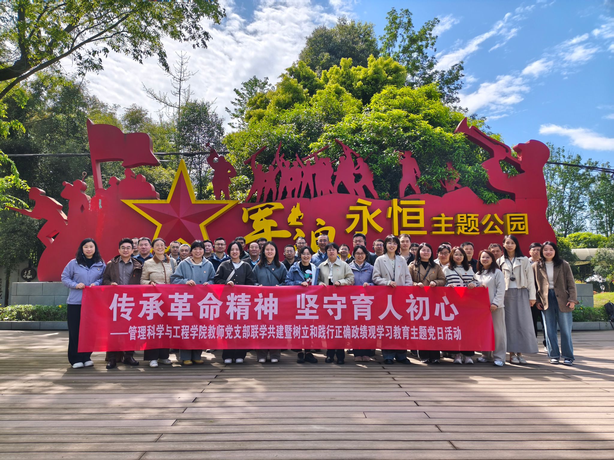 教师第一支部、教师第二支部组织全体党员干部共赴崇州军魂永恒(学习强国)主题公园,联合开展了以“传承革命精神 坚守育人初心”为主题的联学共建活动,在循足迹、悟思想中深刻把握正确政绩观的丰富内涵。