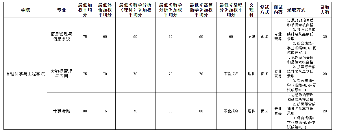 信息管理与信息系统 | 专业素养 | 1.在思政素质考查合格且复试成绩不低于60分(满分100分)的前提下,按照综合成绩排名录取 2.综合成绩=学业成绩加权平均成绩*0.6+复试成绩*0.4 |