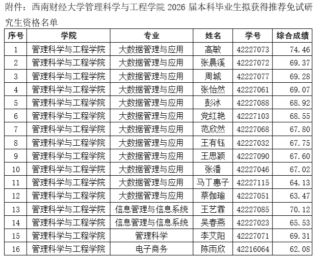 推荐免试研究生管理办法》和学院推免细则规定,经学院推免工作小组考核、公示及推荐,现将2026届本科毕业生拟获得推荐免试攻读研究生资格的同学名单公示于后(见附件)。